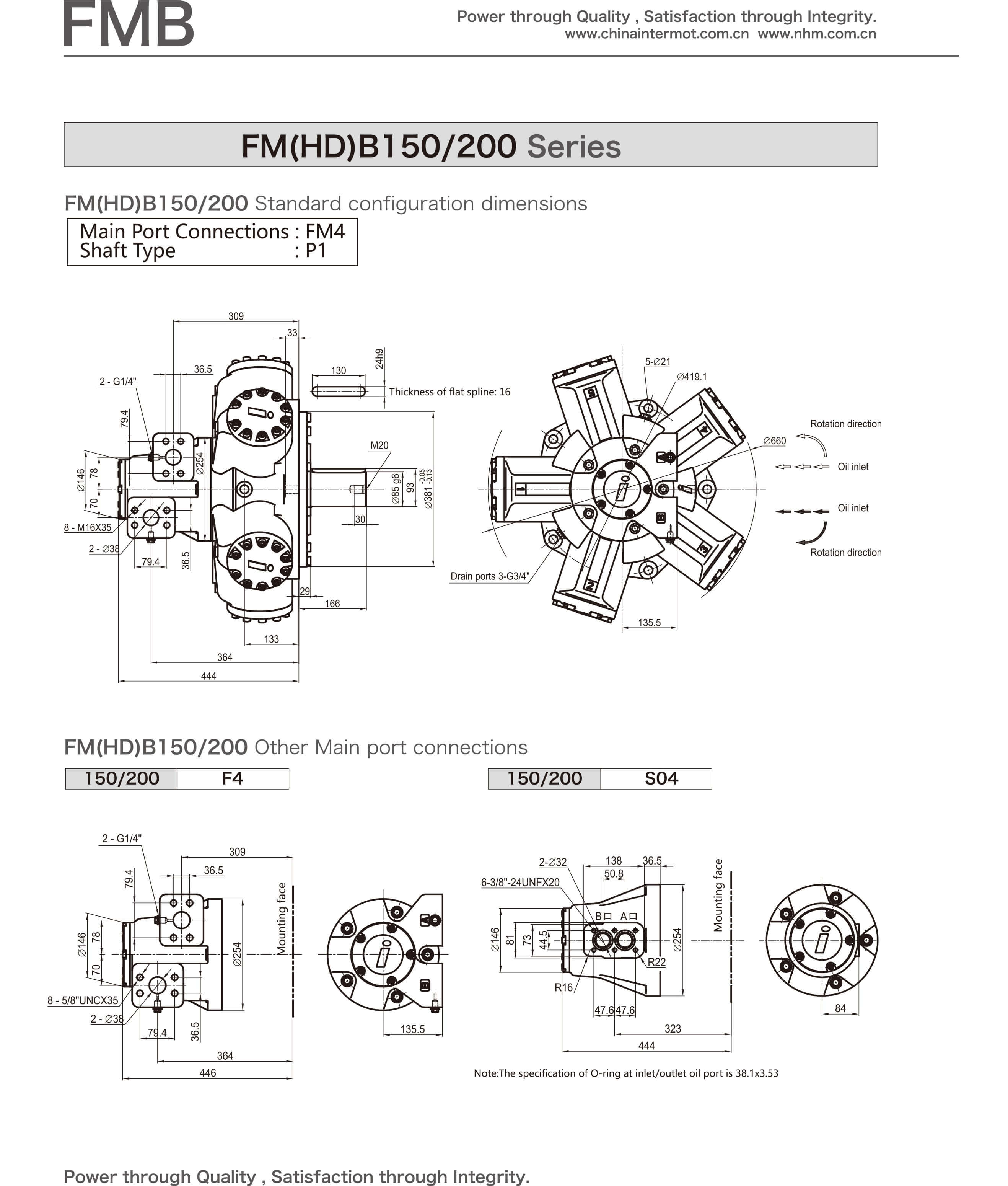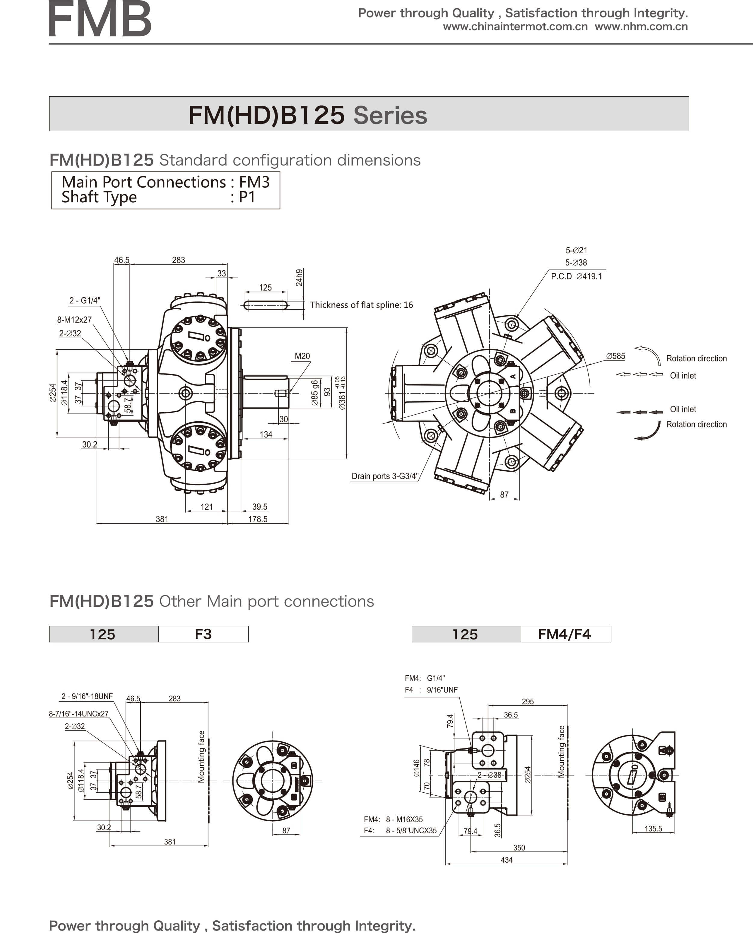 FMBseries hydraulic motors, recently launched products with new structures of the company, embody years of experi- ences of INTERMOT in manufacturing hydraulic motors and enjoy the advantages of internal/external crank shaft hydraulic motors worldwide , which contributes to the significant enhancement of pressure grade and speed range of hydraulic motors. The motors falling into this series are characterized by outstanding reliability, high efficiency, long service life, low noise level and wide speed range, etC., so that they widely used in the hydraulic transmission systems in a number of industries such as marine, plastic machinery, mining, construction, metallurgy, petroleum, and geological prospecting, etc..