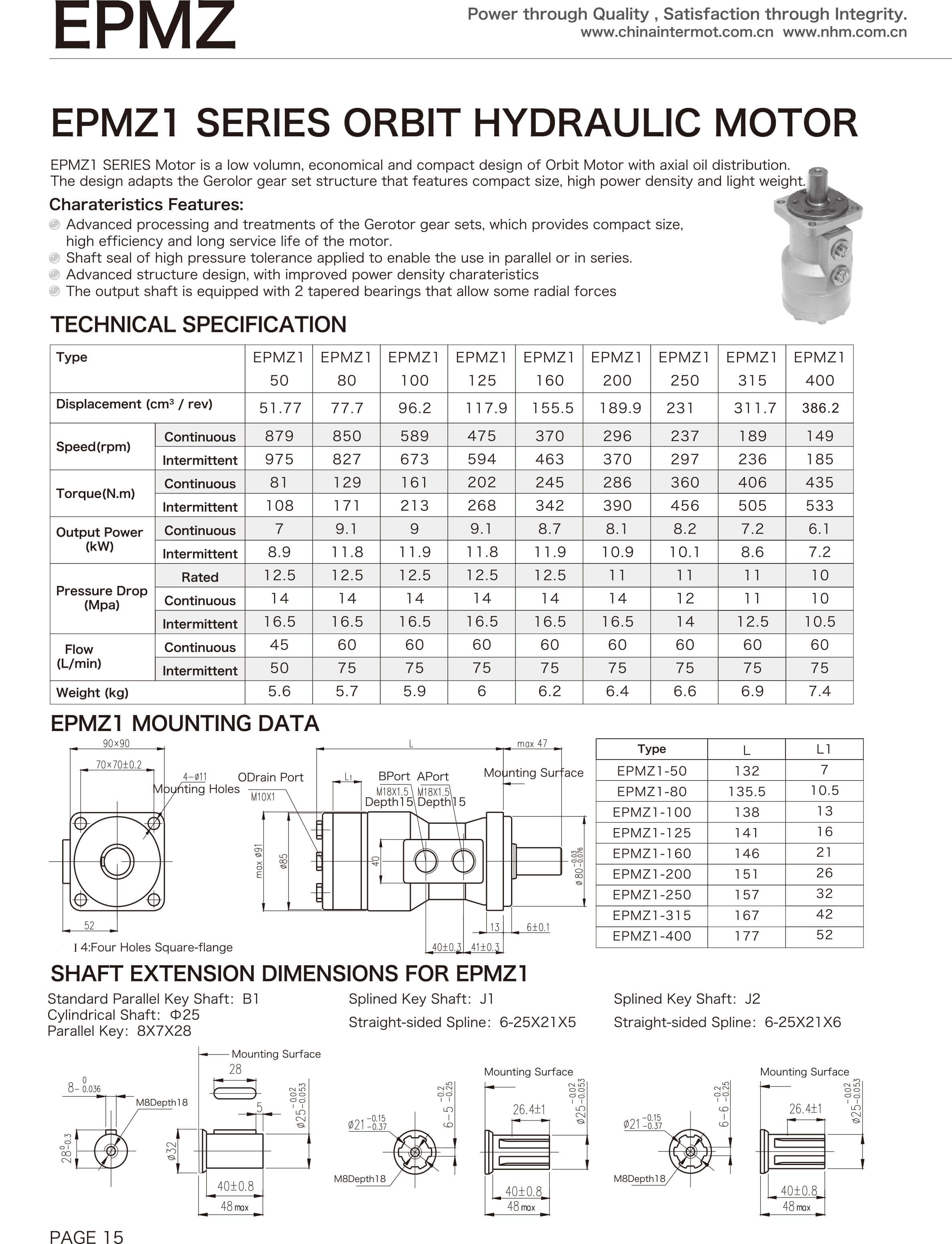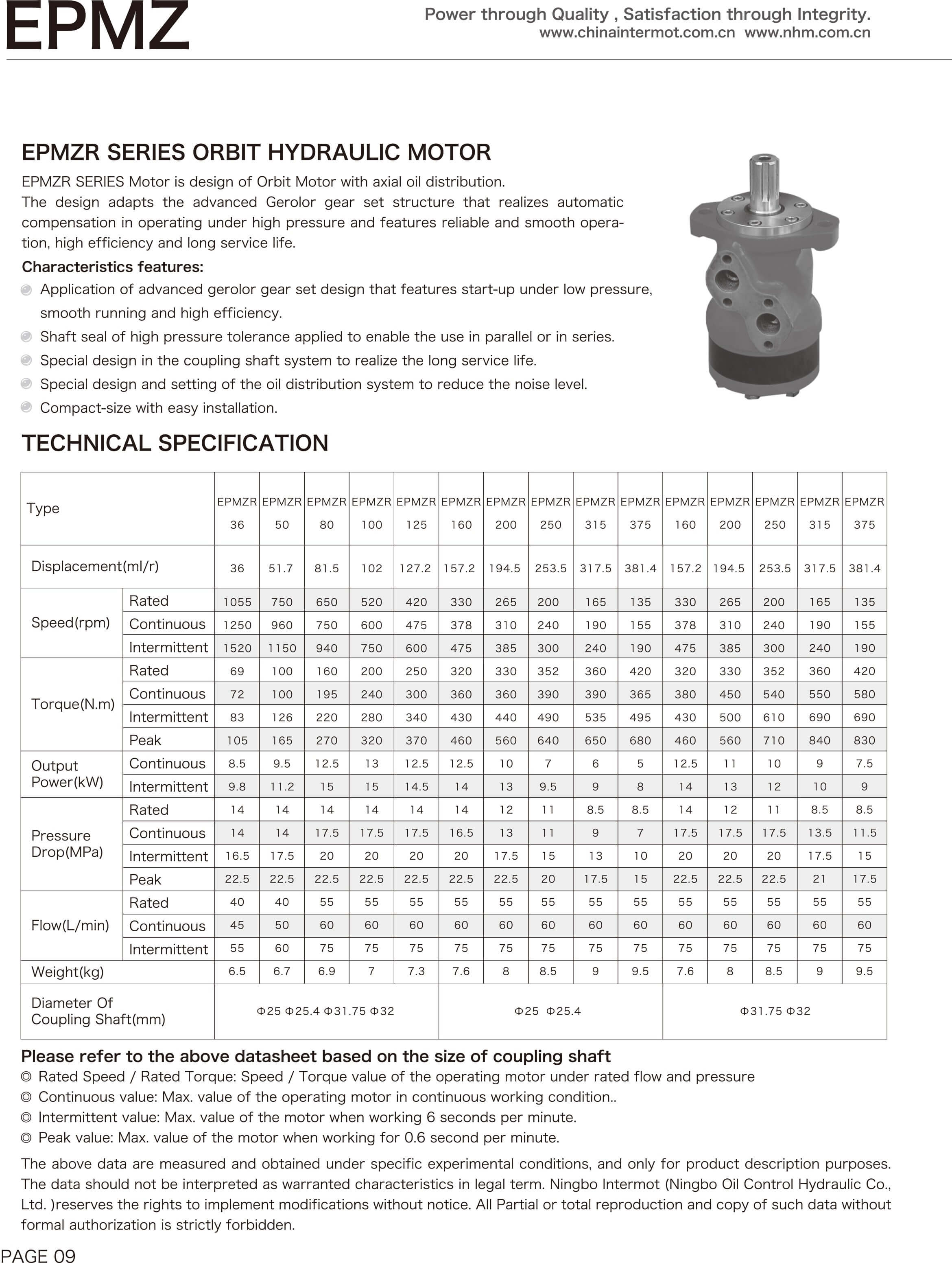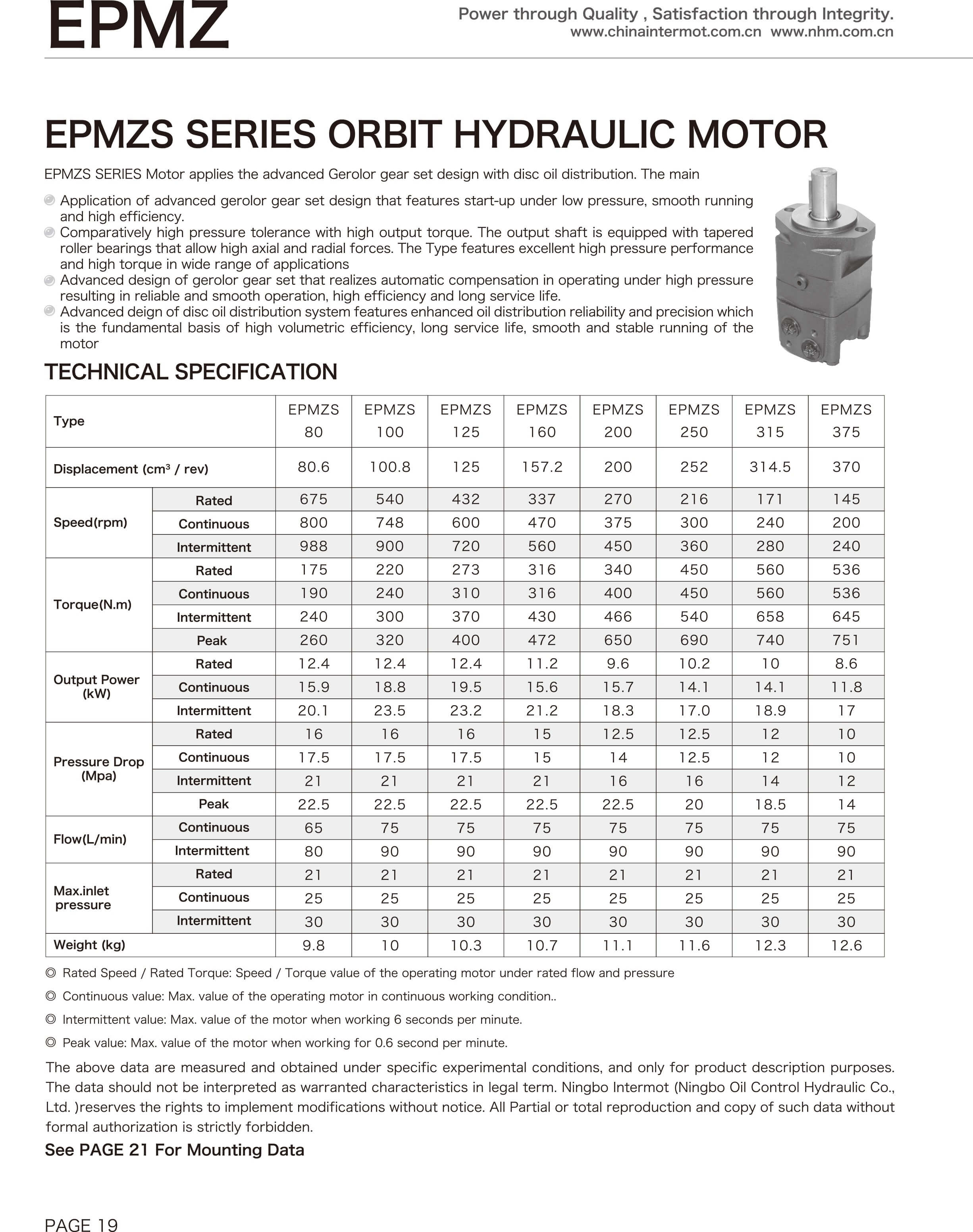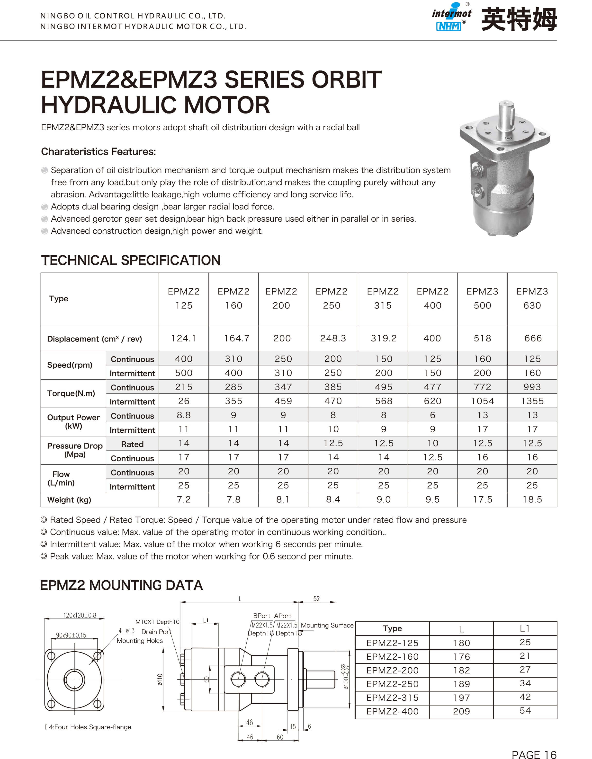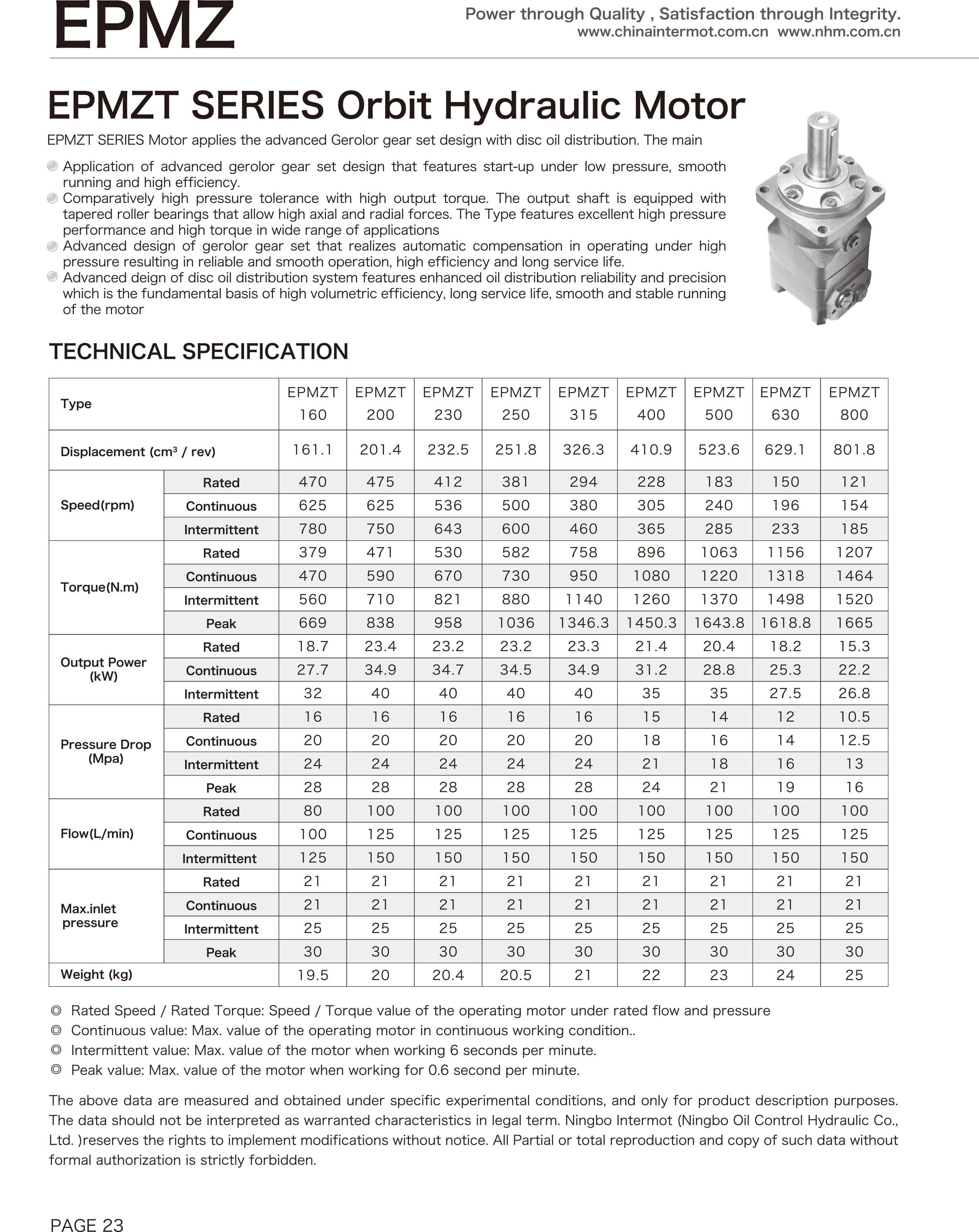 The INTERMOT EPMZ Category is a type of Low Speed High Torque (LSHT) Hydraulic Motor developed based on the orbit principle and planetary cycloid transmission mechanism, where an internal gear is engaged with a fixed planetary gear. The EPMZ design is known for its high power efficiency, low-speed reliability and economic performance. EPMZ array of products feature both axial distribution and disc distribution, to fulfill the customers’needs in various applications in plastic injection mould adjusting,grinders, sprayers, augers and other construction machinery, agricultural equipments, hoisting equipments etc...Within the EPMZ category, there are EPMZM, EPMZ, EPMZR, EPMZ1, EPMZH, EPMZ2, EPMZ3, EPMZS,EPMZY, EPMZT & EPMZV series of motors, with diversified structure and technical features to fulfill the specific application requirements of the customers.