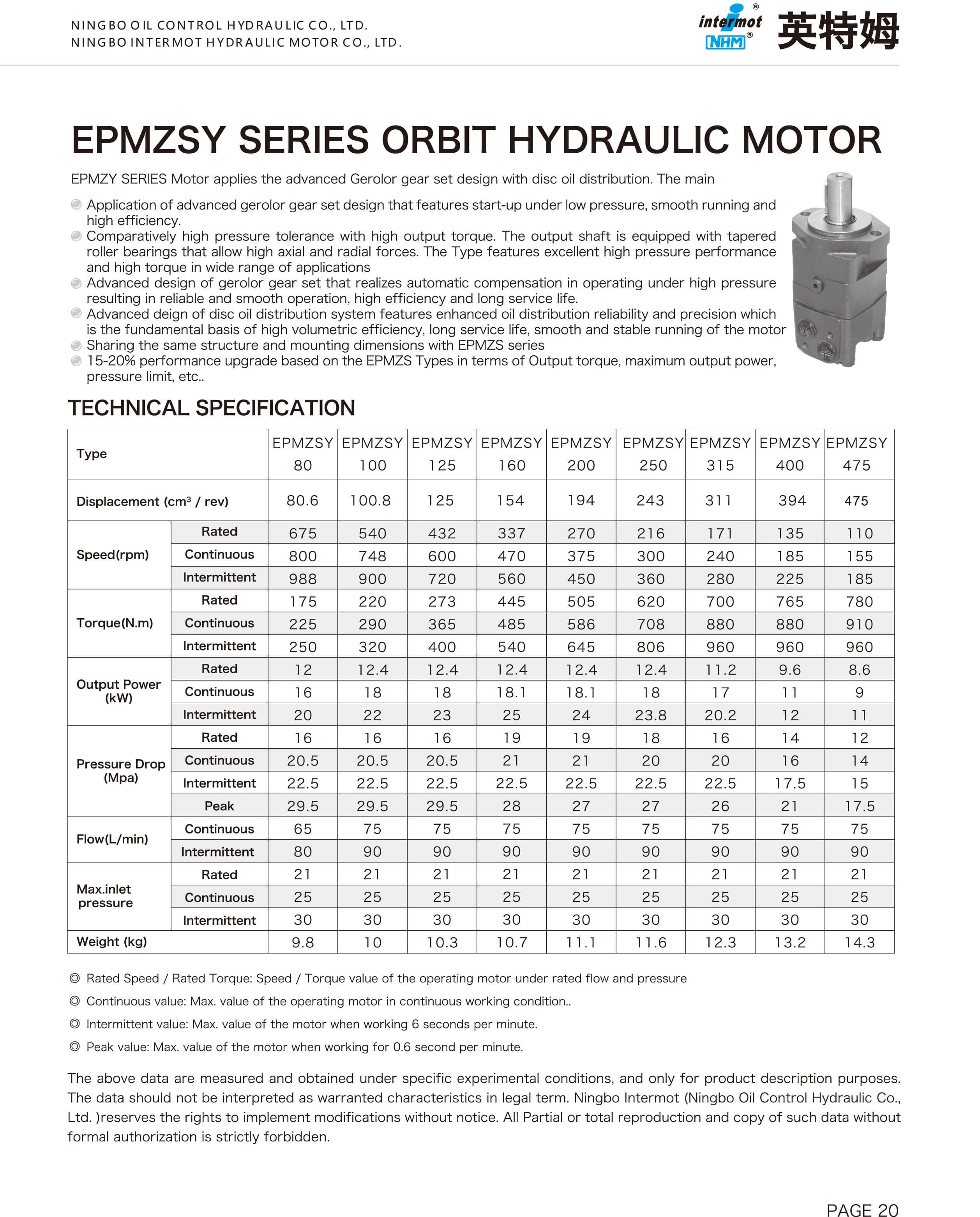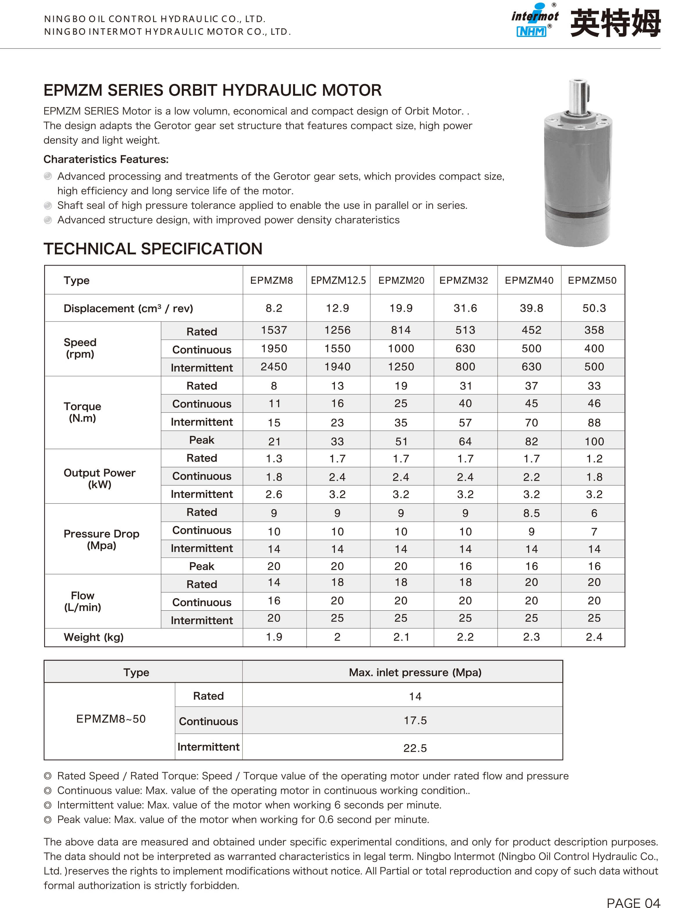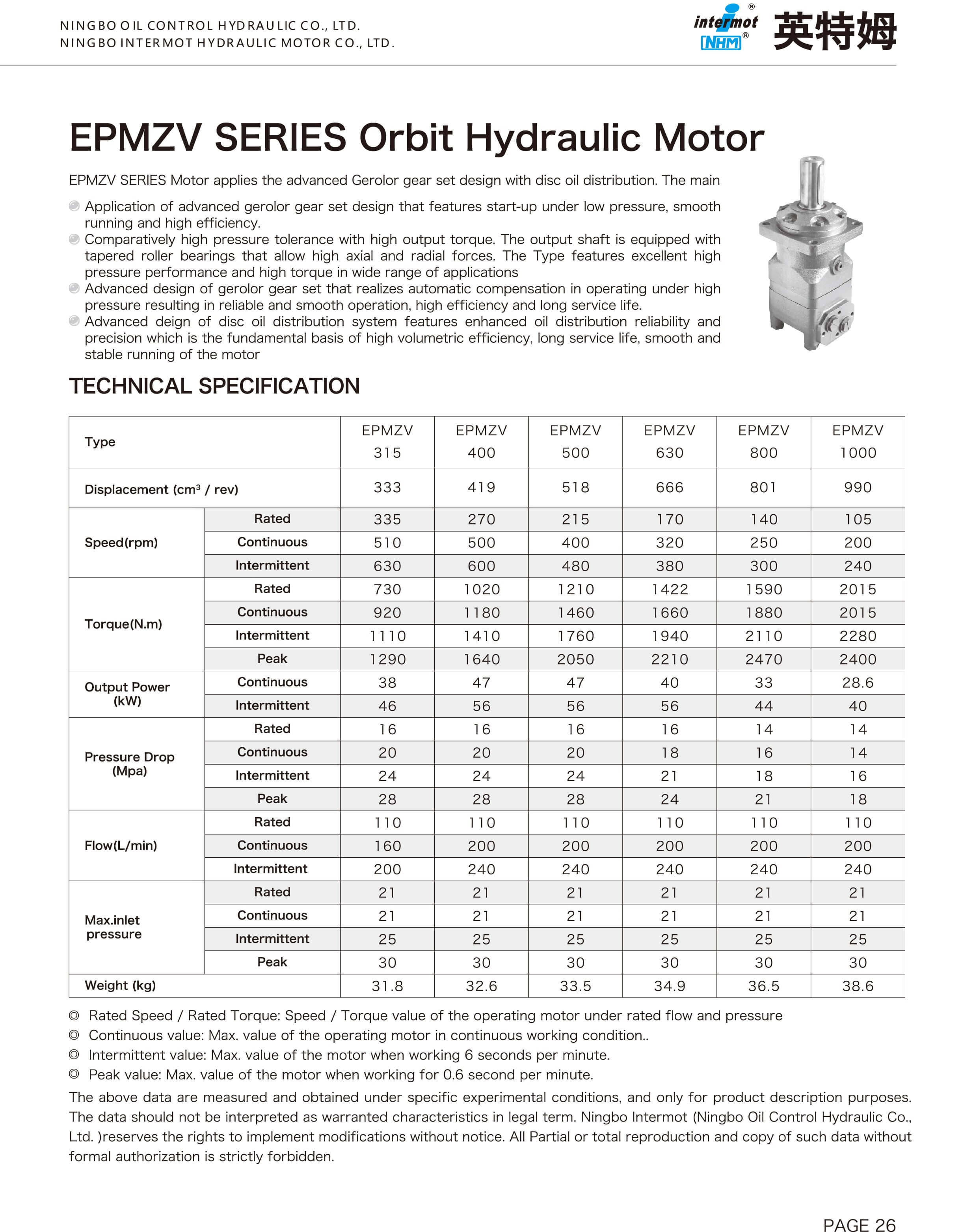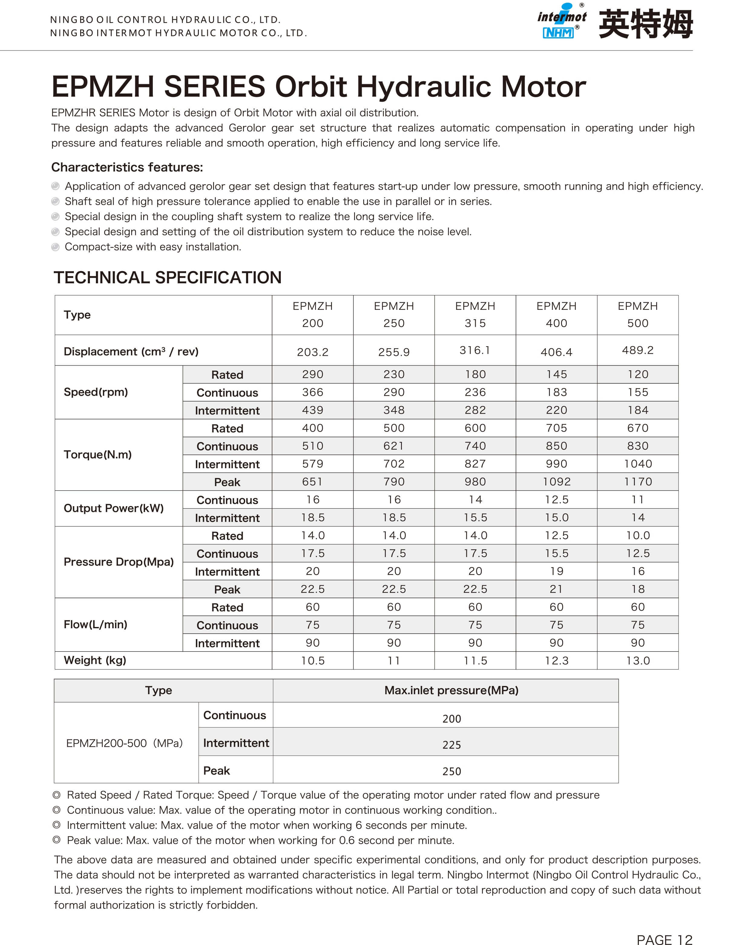 The INTERMOT EPMZ Category is a type of Low Speed High Torque (LSHT) Hydraulic Motor developed based on the orbit principle and planetary cycloid transmission mechanism, where an internal gear is engaged with a fixed planetary gear. The EPMZ design is known for its high power efficiency, low-speed reliability and economic performance. EPMZ array of products feature both axial distribution and disc distribution, to fulfill the customers’needs in various applications in plastic injection mould adjusting,grinders, sprayers, augers and other construction machinery, agricultural equipments, hoisting equipments etc...Within the EPMZ category, there are EPMZM, EPMZ, EPMZR, EPMZ1, EPMZH, EPMZ2, EPMZ3, EPMZS,EPMZY, EPMZT & EPMZV series of motors, with diversified structure and technical features to fulfill the specific application requirements of the customers.