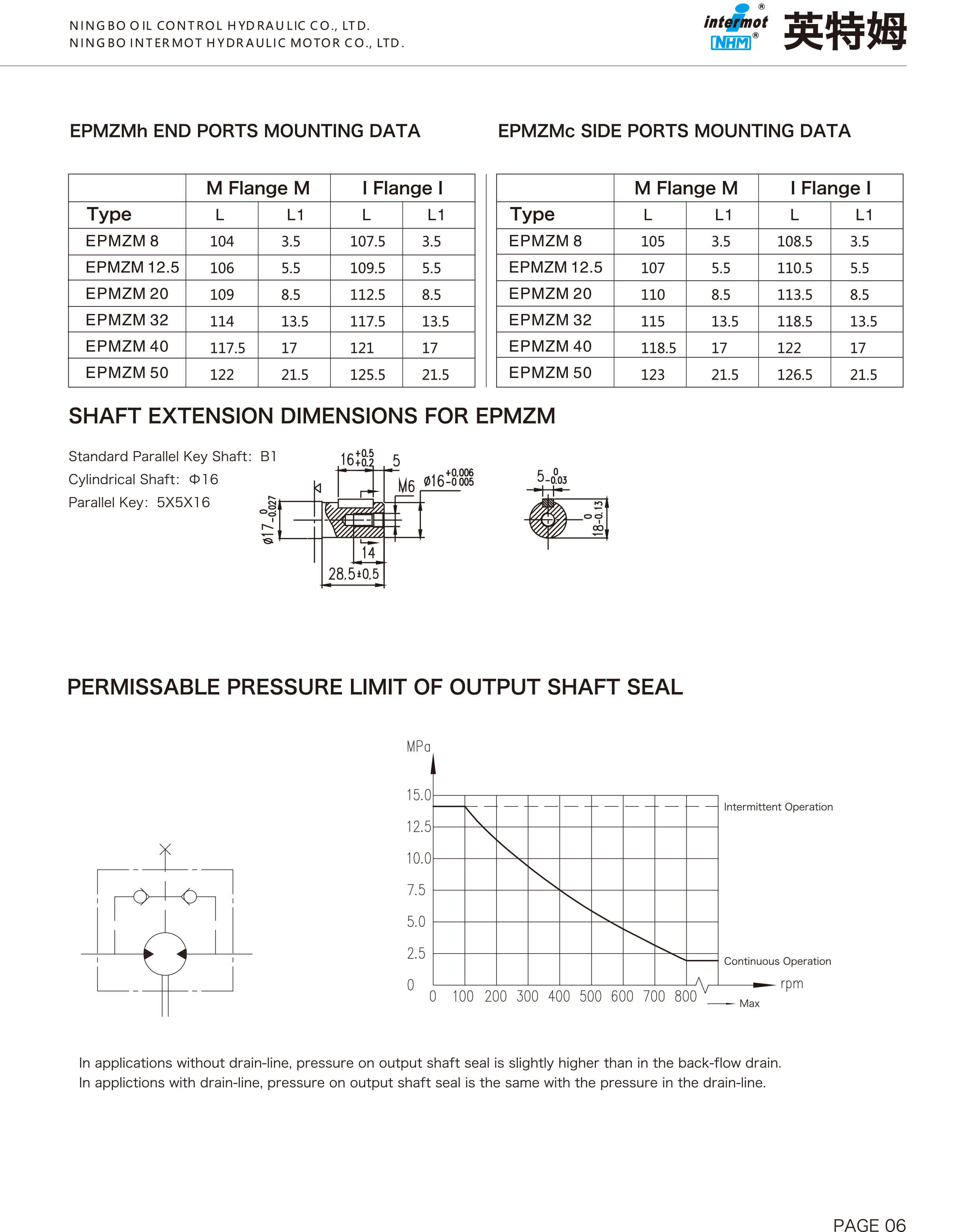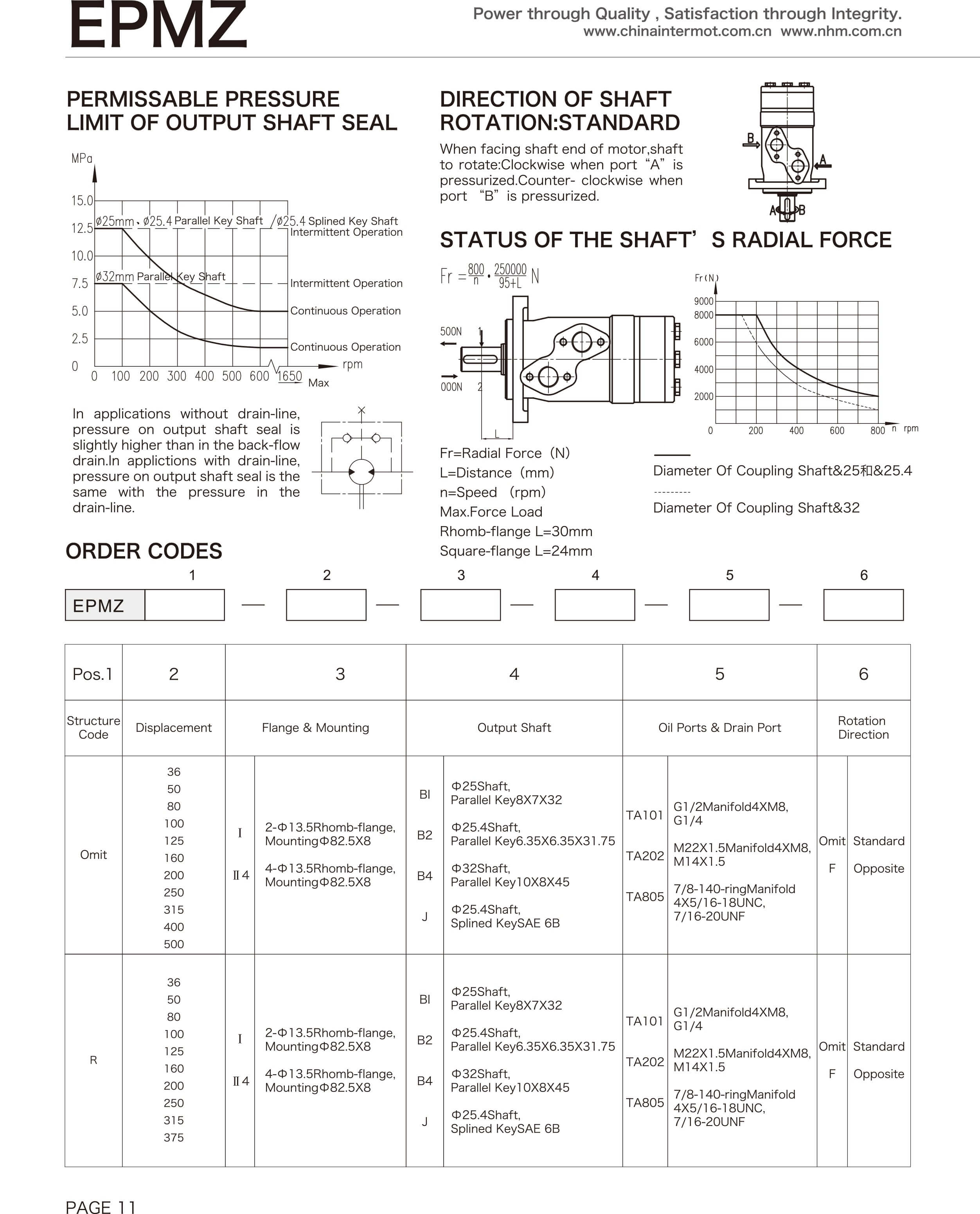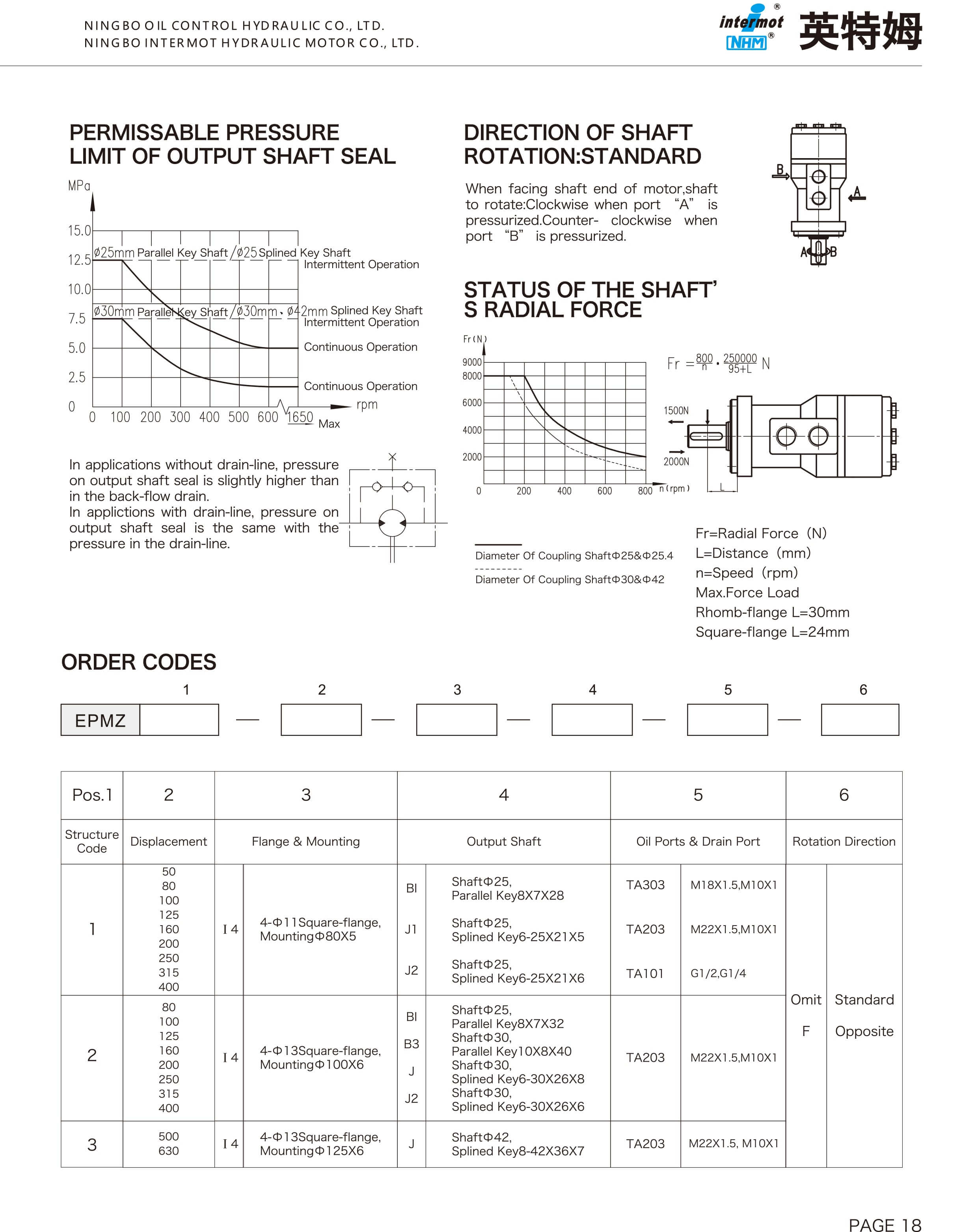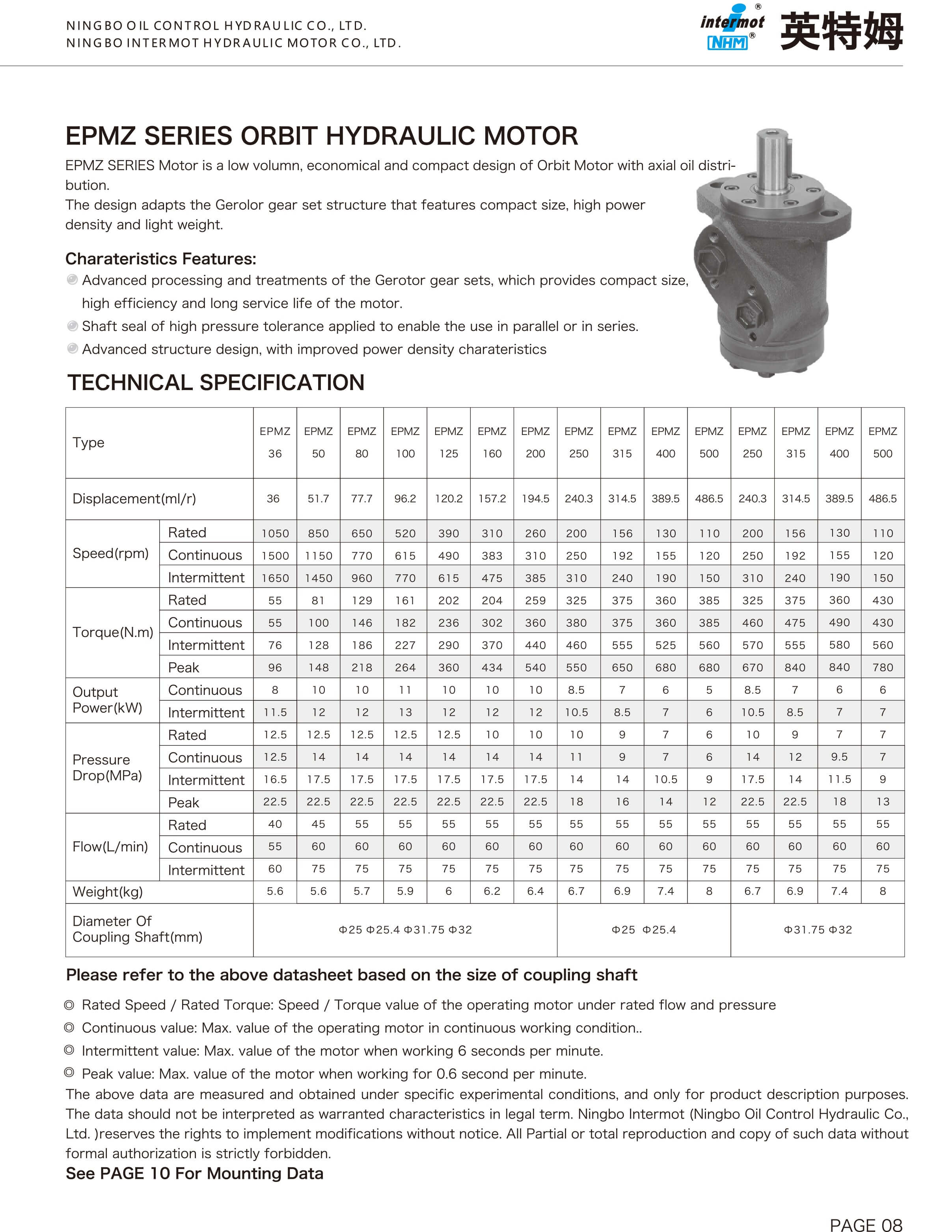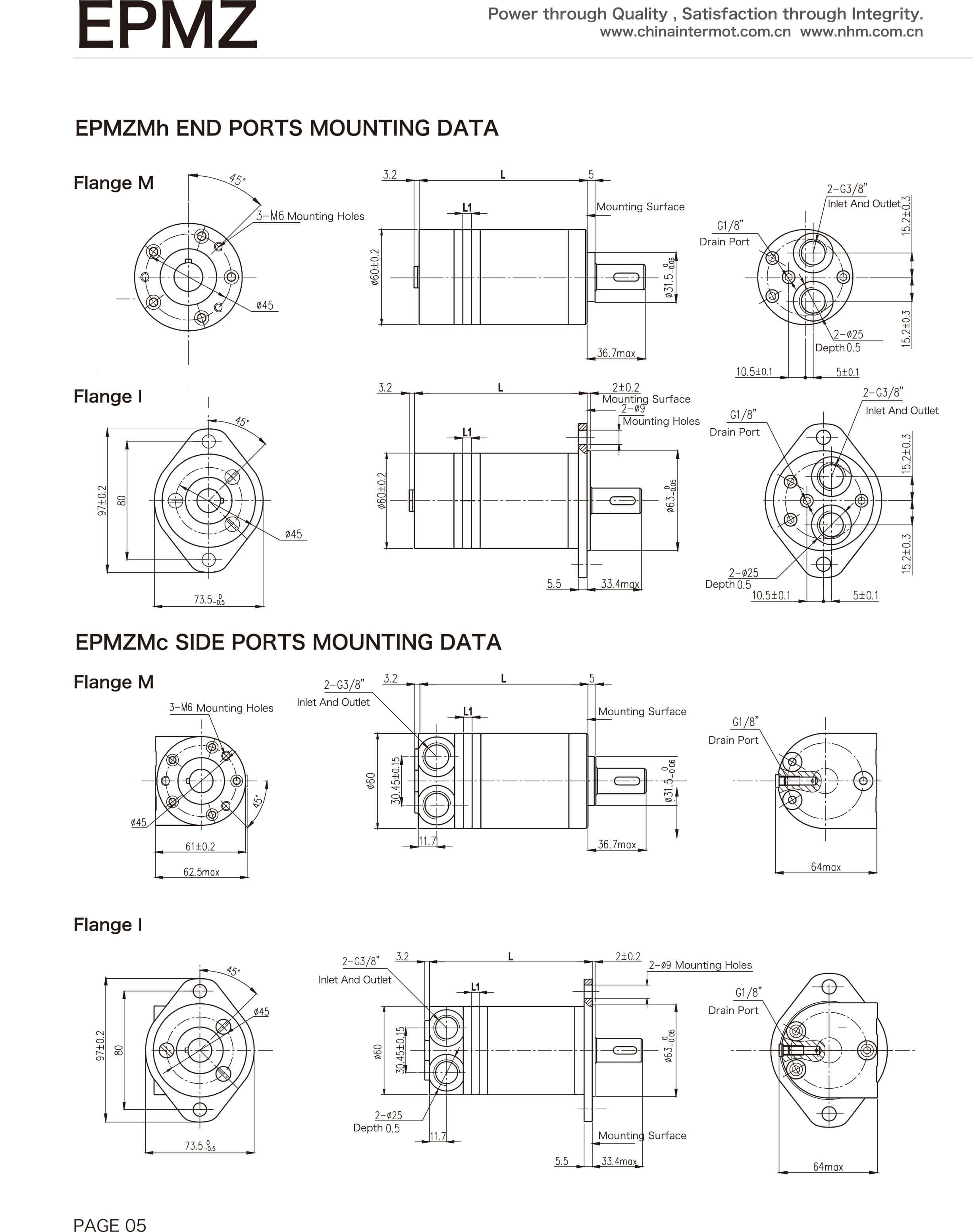 The INTERMOT EPMZ Category is a type of Low Speed High Torque (LSHT) Hydraulic Motor developed based on the orbit principle and planetary cycloid transmission mechanism, where an internal gear is engaged with a fixed planetary gear. The EPMZ design is known for its high power efficiency, low-speed reliability and economic performance. EPMZ array of products feature both axial distribution and disc distribution, to fulfill the customers’needs in various applications in plastic injection mould adjusting,grinders, sprayers, augers and other construction machinery, agricultural equipments, hoisting equipments etc...Within the EPMZ category, there are EPMZM, EPMZ, EPMZR, EPMZ1, EPMZH, EPMZ2, EPMZ3, EPMZS,EPMZY, EPMZT & EPMZV series of motors, with diversified structure and technical features to fulfill the specific application requirements of the customers.
