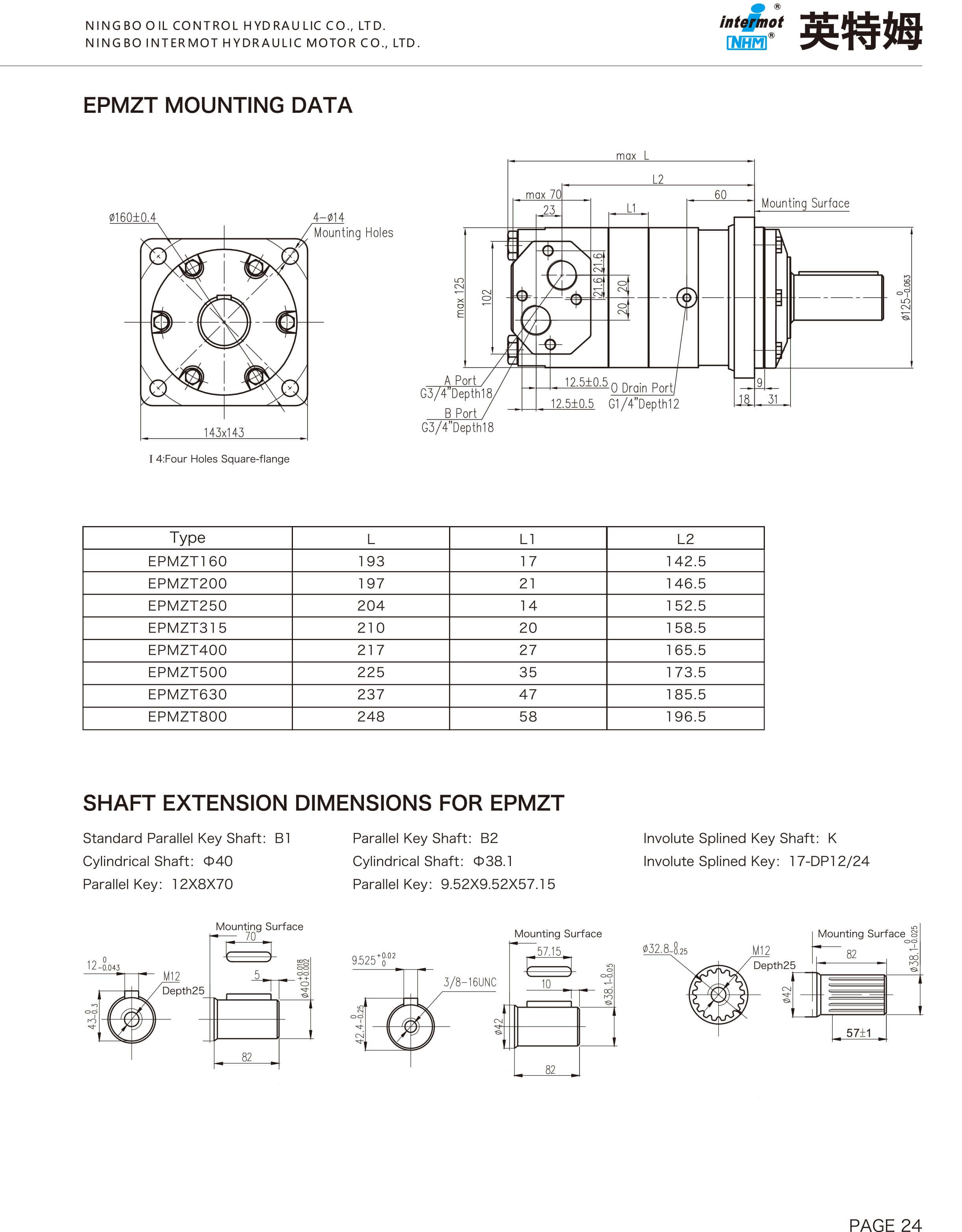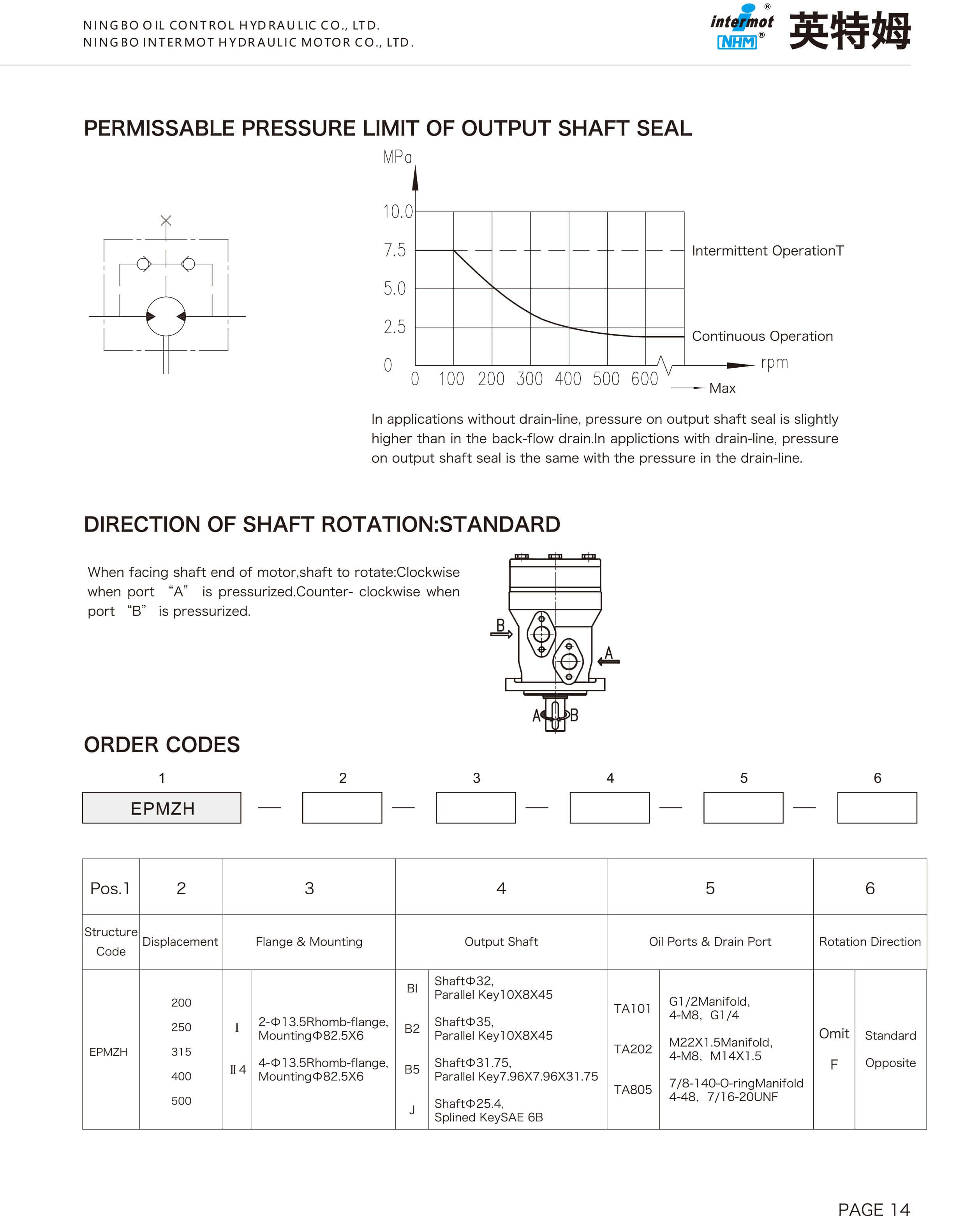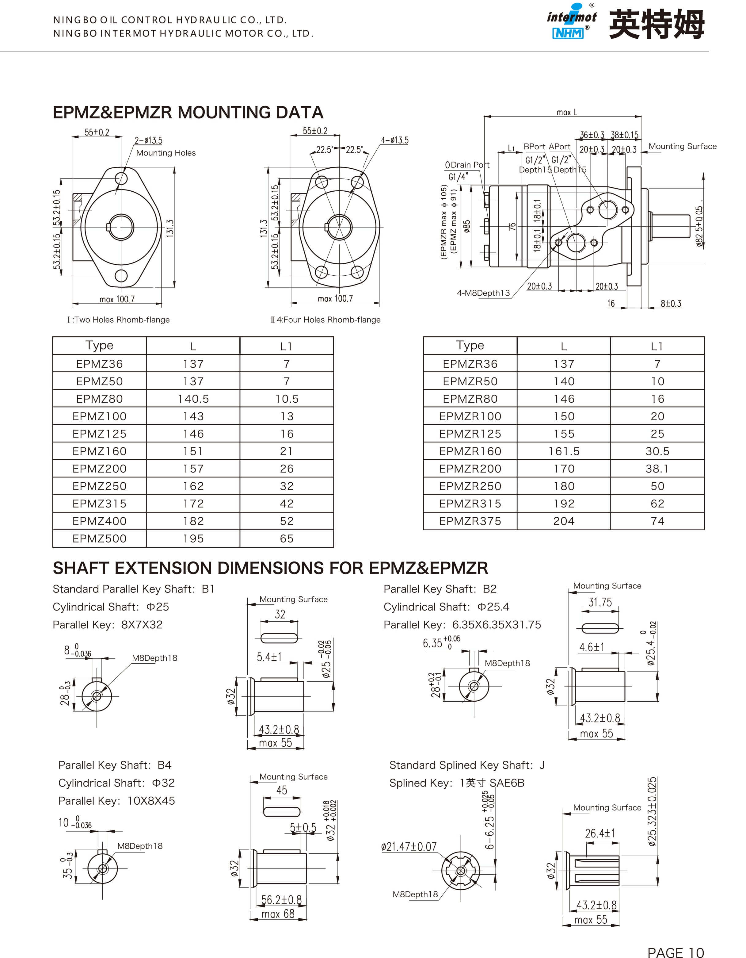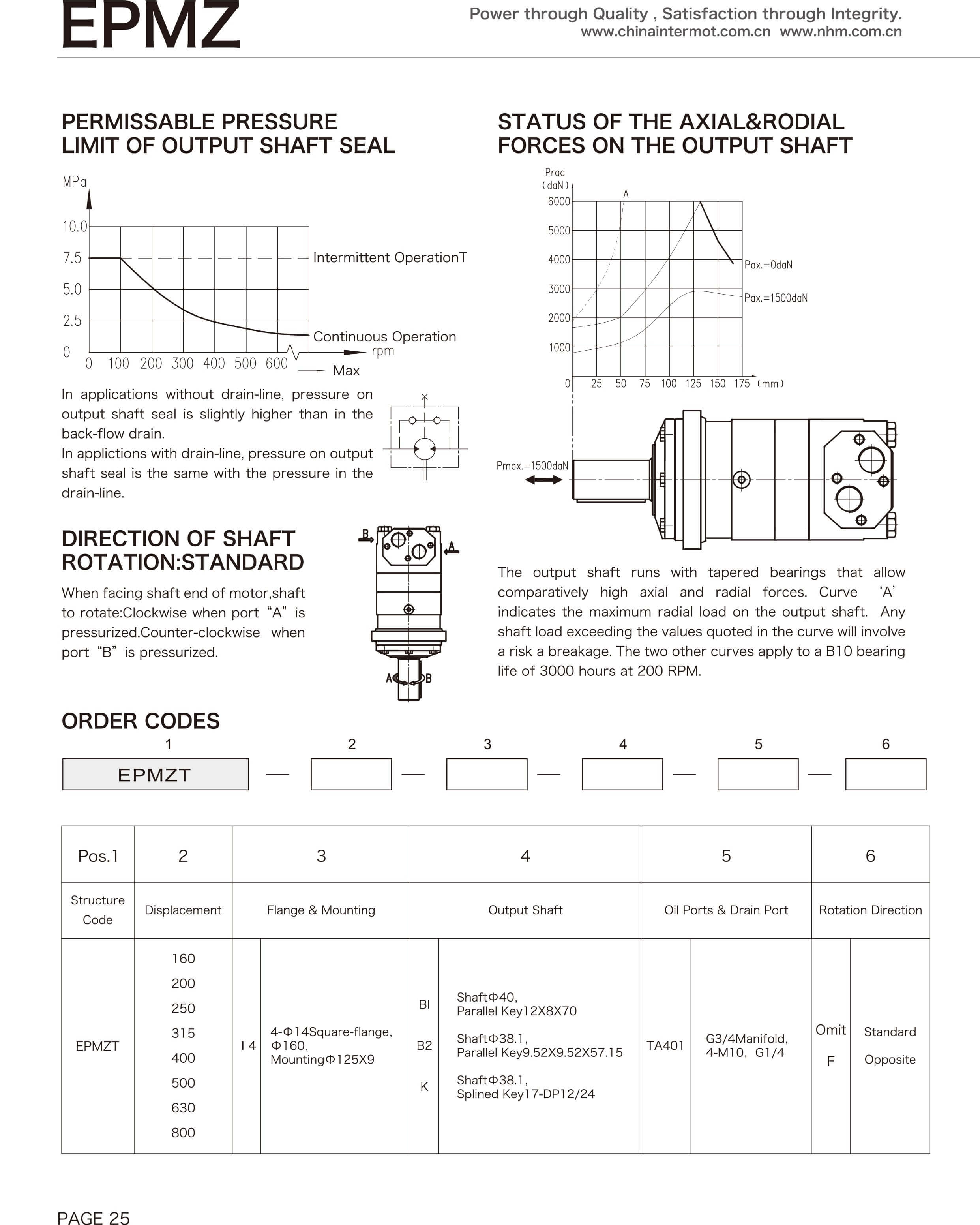 The INTERMOT EPMZ Category is a type of Low Speed High Torque (LSHT) Hydraulic Motor developed based on the orbit principle and planetary cycloid transmission mechanism, where an internal gear is engaged with a fixed planetary gear. The EPMZ design is known for its high power efficiency, low-speed reliability and economic performance. EPMZ array of products feature both axial distribution and disc distribution, to fulfill the customers’needs in various applications in plastic injection mould adjusting,grinders, sprayers, augers and other construction machinery, agricultural equipments, hoisting equipments etc...Within the EPMZ category, there are EPMZM, EPMZ, EPMZR, EPMZ1, EPMZH, EPMZ2, EPMZ3, EPMZS,EPMZY, EPMZT & EPMZV series of motors, with diversified structure and technical features to fulfill the specific application requirements of the customers.