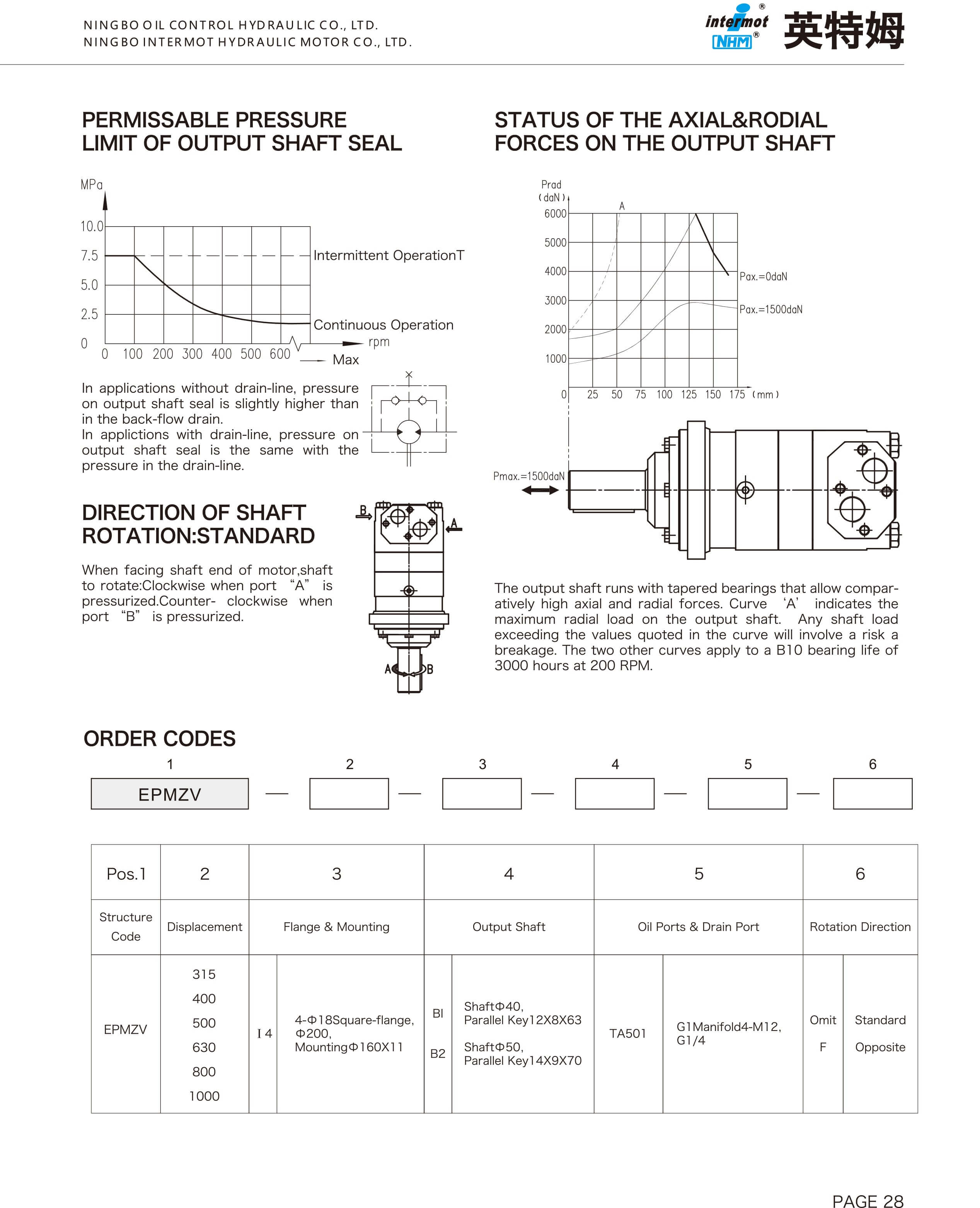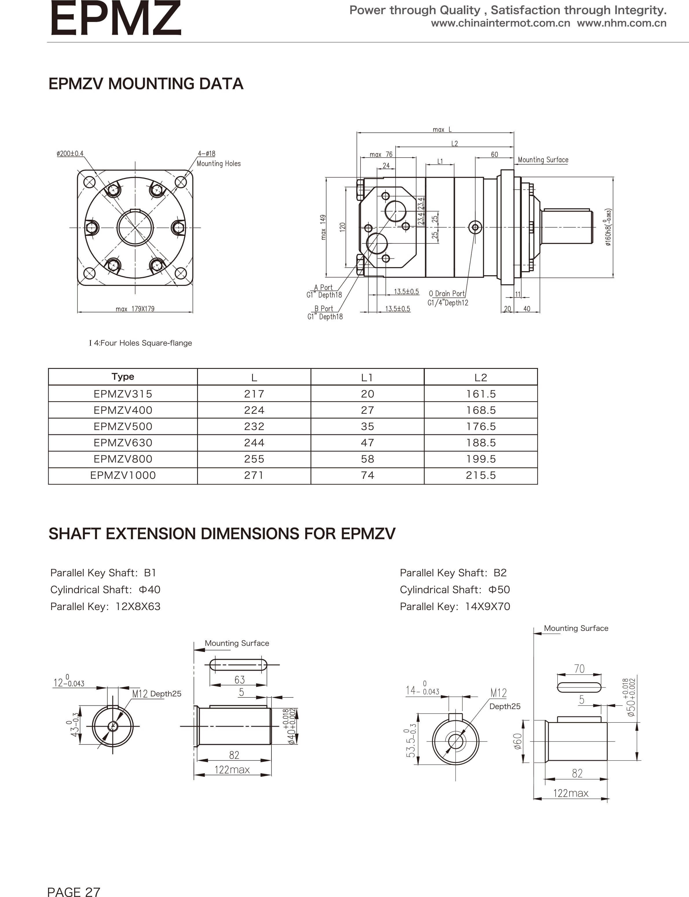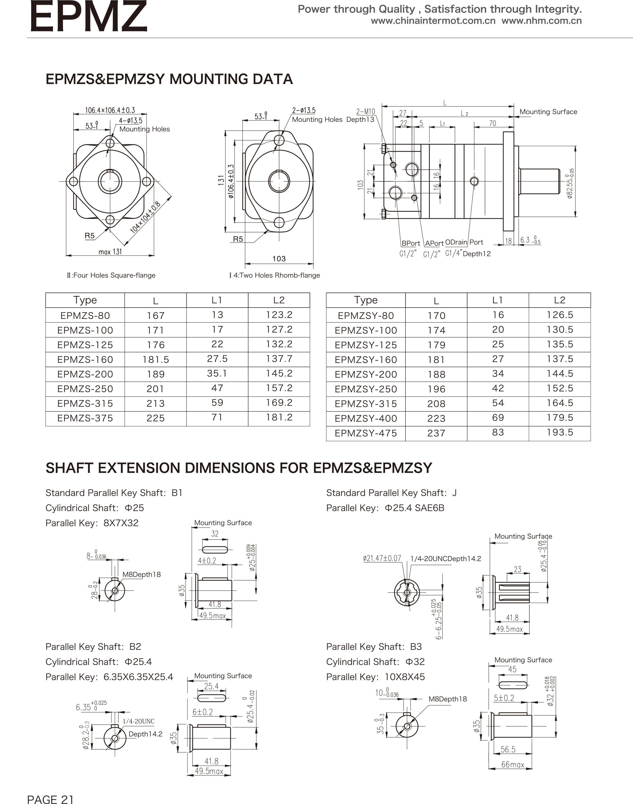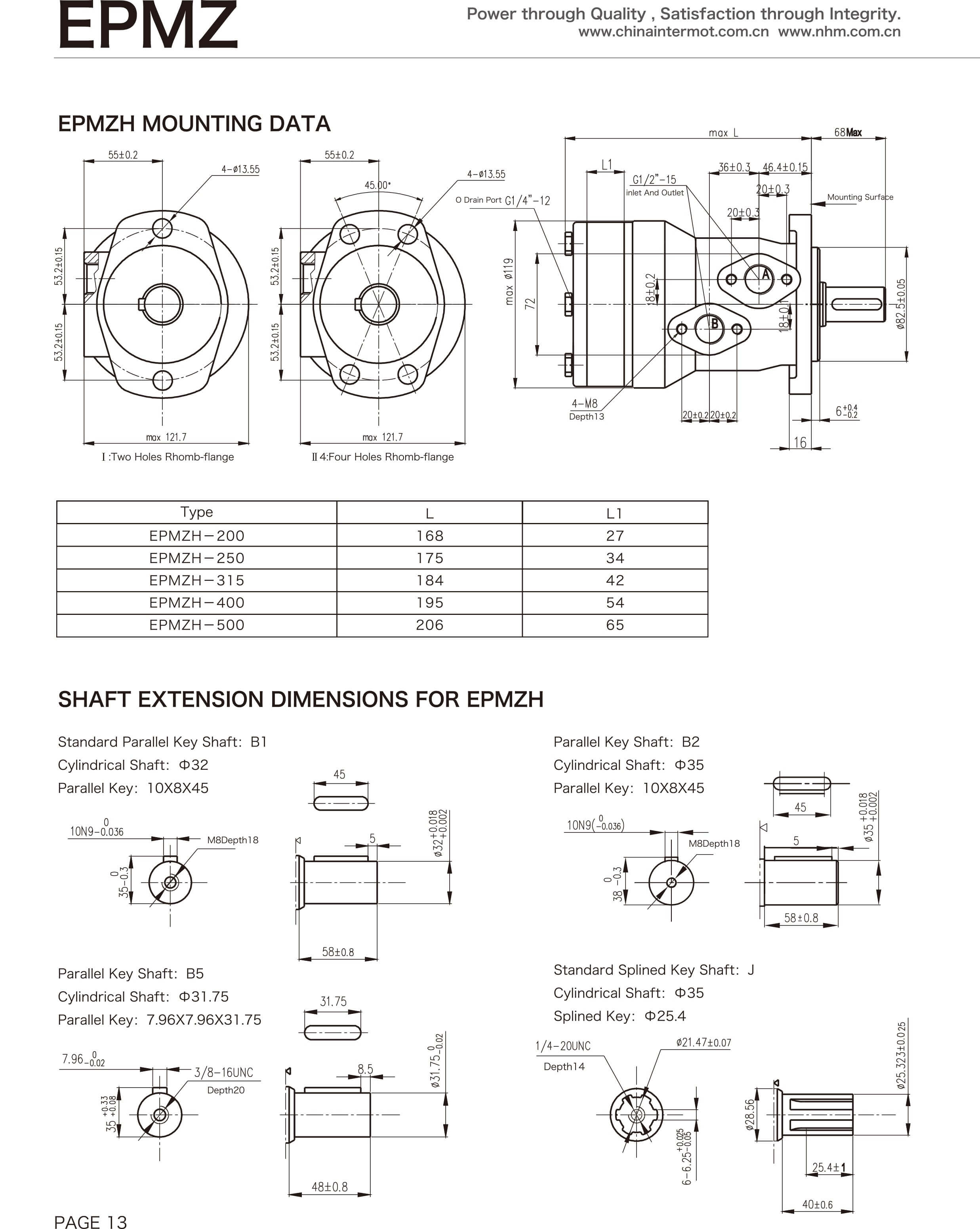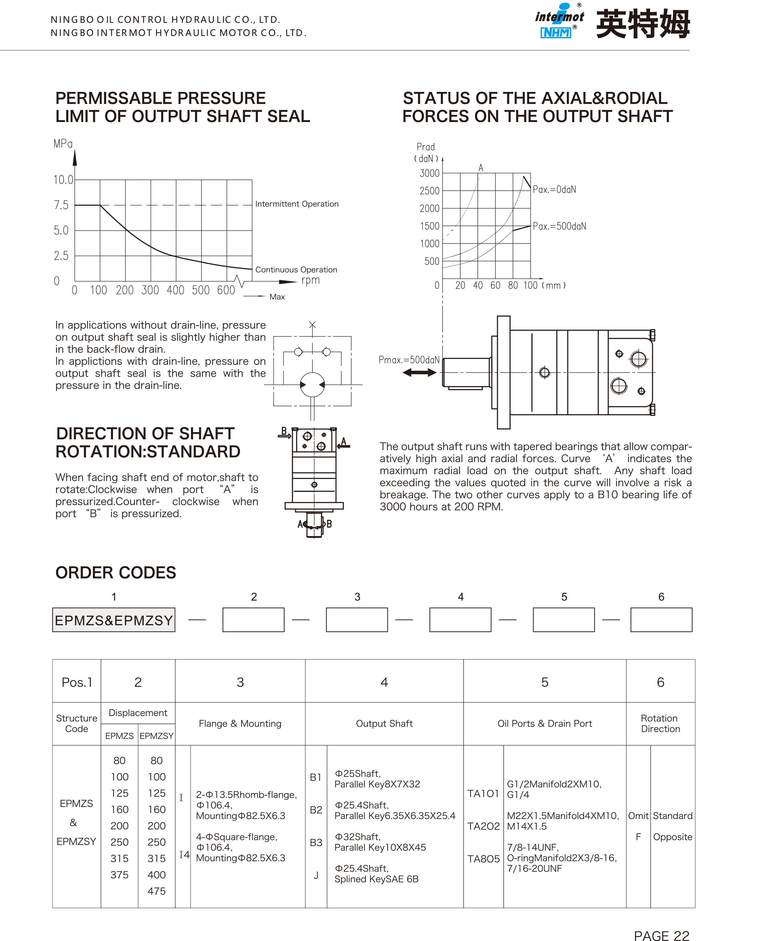 The INTERMOT EPMZ Category is a type of Low Speed High Torque (LSHT) Hydraulic Motor developed based on the orbit principle and planetary cycloid transmission mechanism, where an internal gear is engaged with a fixed planetary gear. The EPMZ design is known for its high power efficiency, low-speed reliability and economic performance. EPMZ array of products feature both axial distribution and disc distribution, to fulfill the customers’needs in various applications in plastic injection mould adjusting,grinders, sprayers, augers and other construction machinery, agricultural equipments, hoisting equipments etc...Within the EPMZ category, there are EPMZM, EPMZ, EPMZR, EPMZ1, EPMZH, EPMZ2, EPMZ3, EPMZS,EPMZY, EPMZT & EPMZV series of motors, with diversified structure and technical features to fulfill the specific application requirements of the customers.