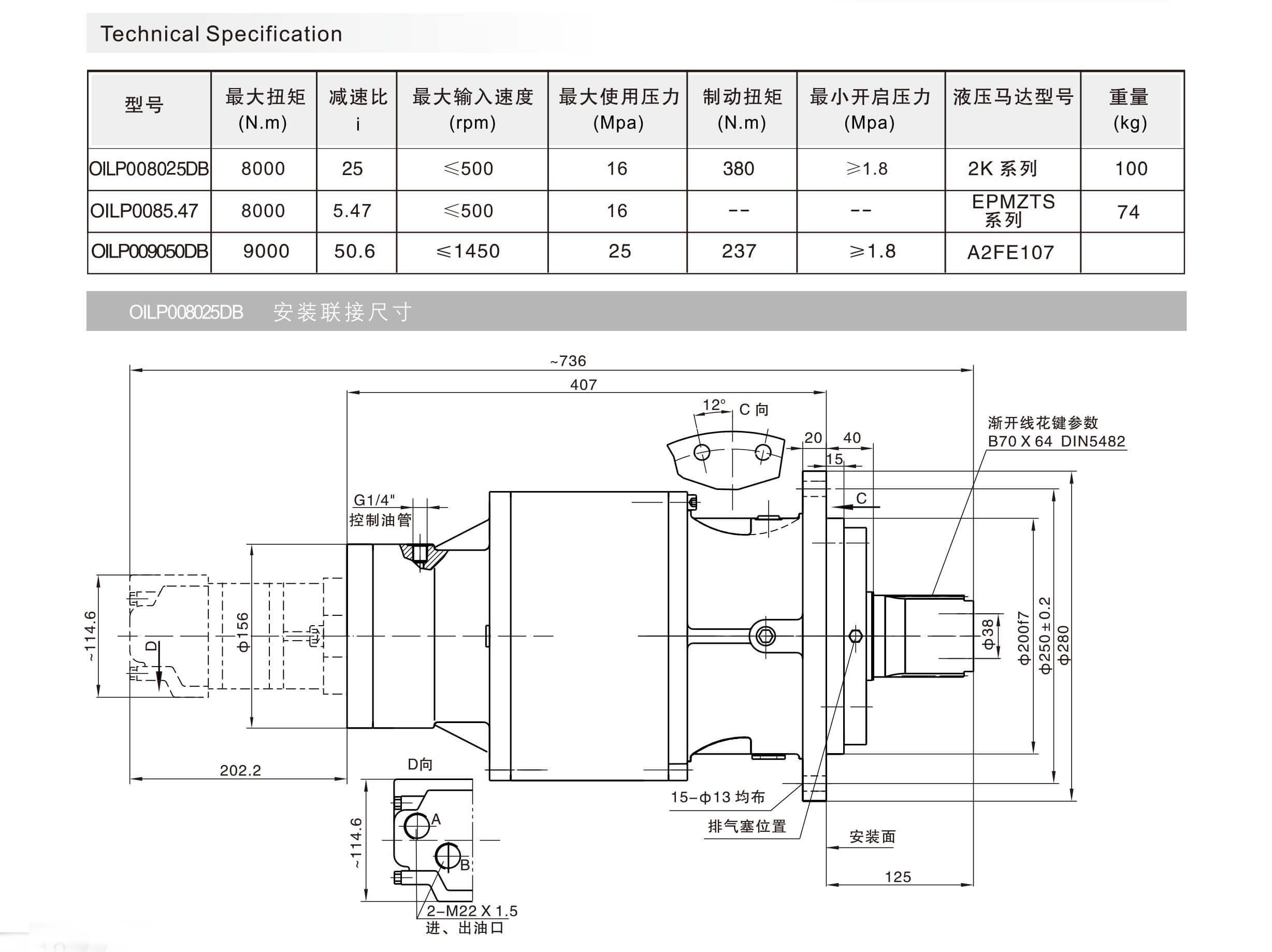 | 型号 | 最大扭矩 (N.m) | 减速比 | 最大输入速度 (rpm) | 最大使用压力 (Mpa) | 制动扭矩 (N.m) | 最小开启压力 (Mpa) | 液压马达型号 | 重量 (kg) |